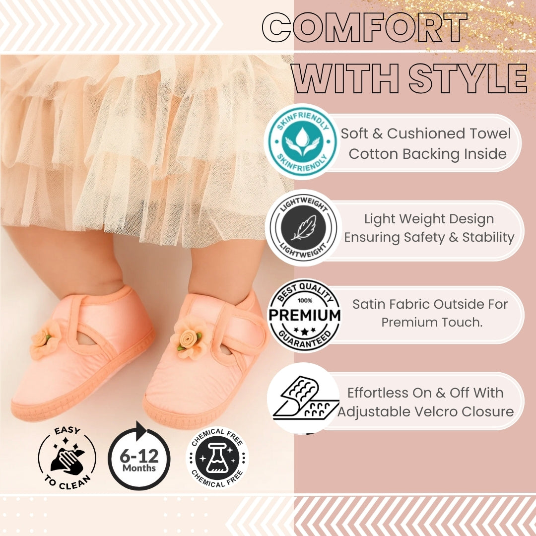 Add a touch of elegance to your little one’s outfit with Neska Moda Baby Girl Party Wear Booties, specially designed for babies aged 0–6 months with an ideal foot length of 10.5 cm. Crafted with a premium satin upper and soft terry cotton backing inside, these booties ensure both style and comfort for delicate baby feet. The lightweight design makes them easy to wear for long hours, while the Velcro closure allows for effortless wearing and a snug, adjustable fit. A beautiful flower embellishment on top adds a glamorous and graceful touch, making these booties the perfect match for party dresses and special occasions. Made from skin-friendly materials with no chemicals used, these booties provide complete safety along with elegance—making them an ideal choice for your baby girl’s footwear collection.